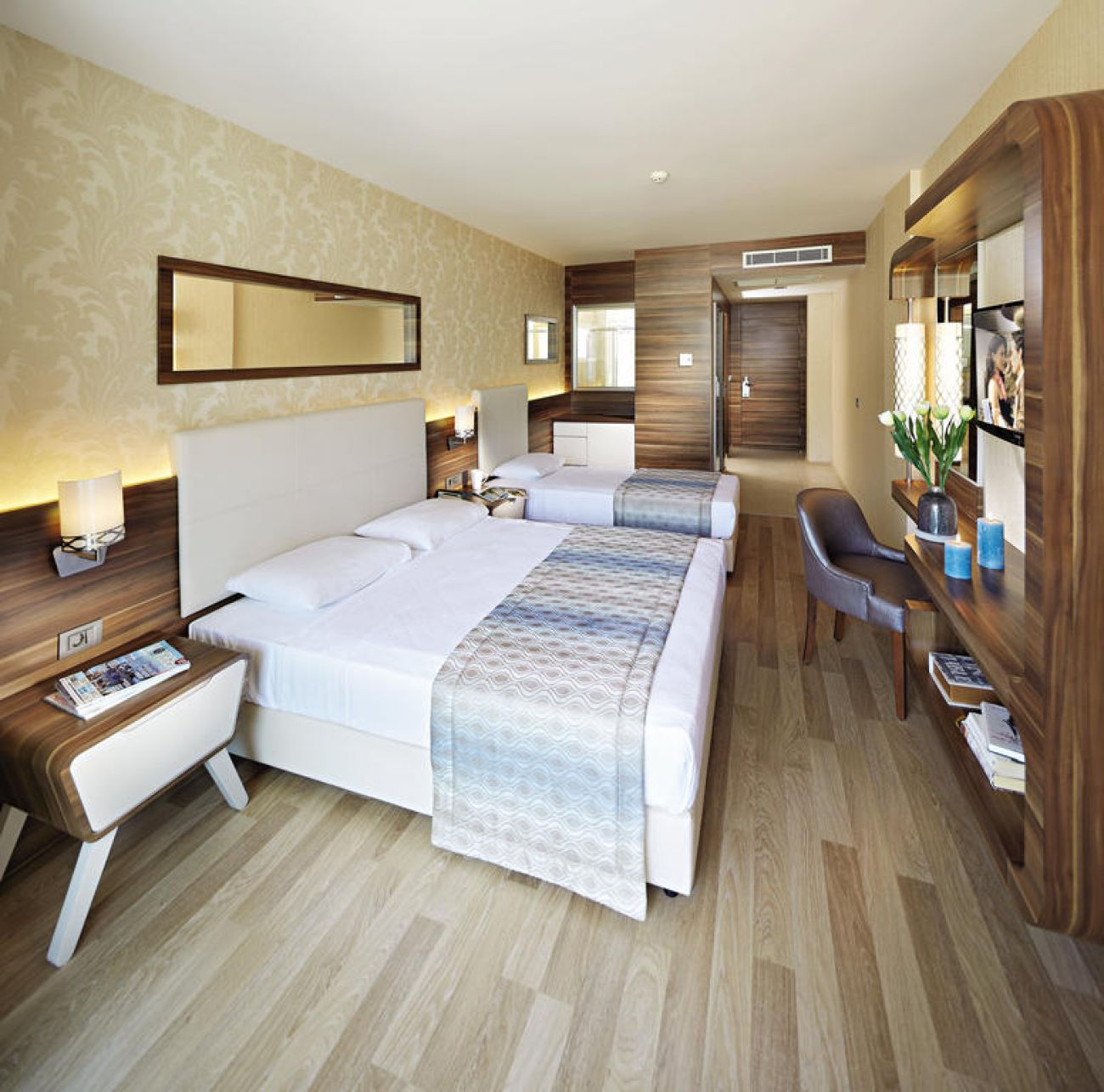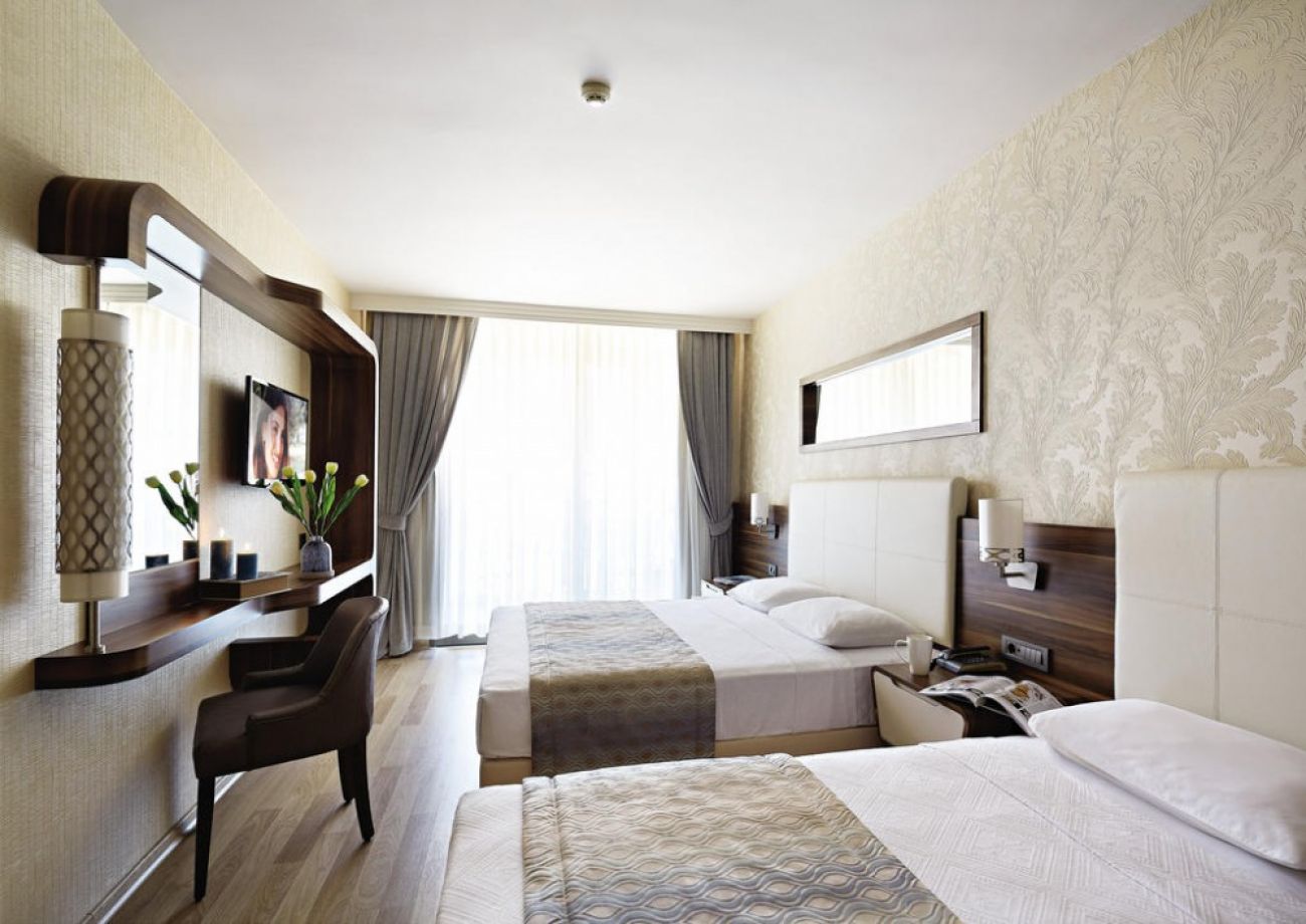 Хотелът разполага общо с 170 стаи, от които Standard rooms (15 - 24 m2), Suite Rooms (спалня и всекидневна, 32 m2), Superior rooms. Всички стаи са оборудвани с климатик, телевизор, телефон, баня с душ, сешоар, мини бар (вода- безплатно, само при пристигане), сейф (безплатен), балкон. Почистване на стаите – всеки ден, смяна на спалното бельо и кърпите – 2 пъти в седмицата.