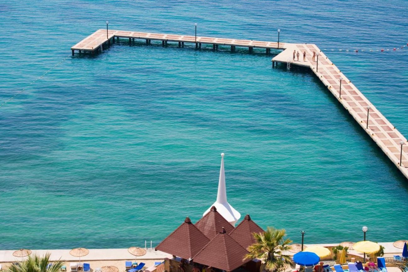 Платформа с дължина 150 м. и ширина 20 м. Чадъри, шезлонги, матраци и плажни кърпи на плажа и при басейна - безплатно.