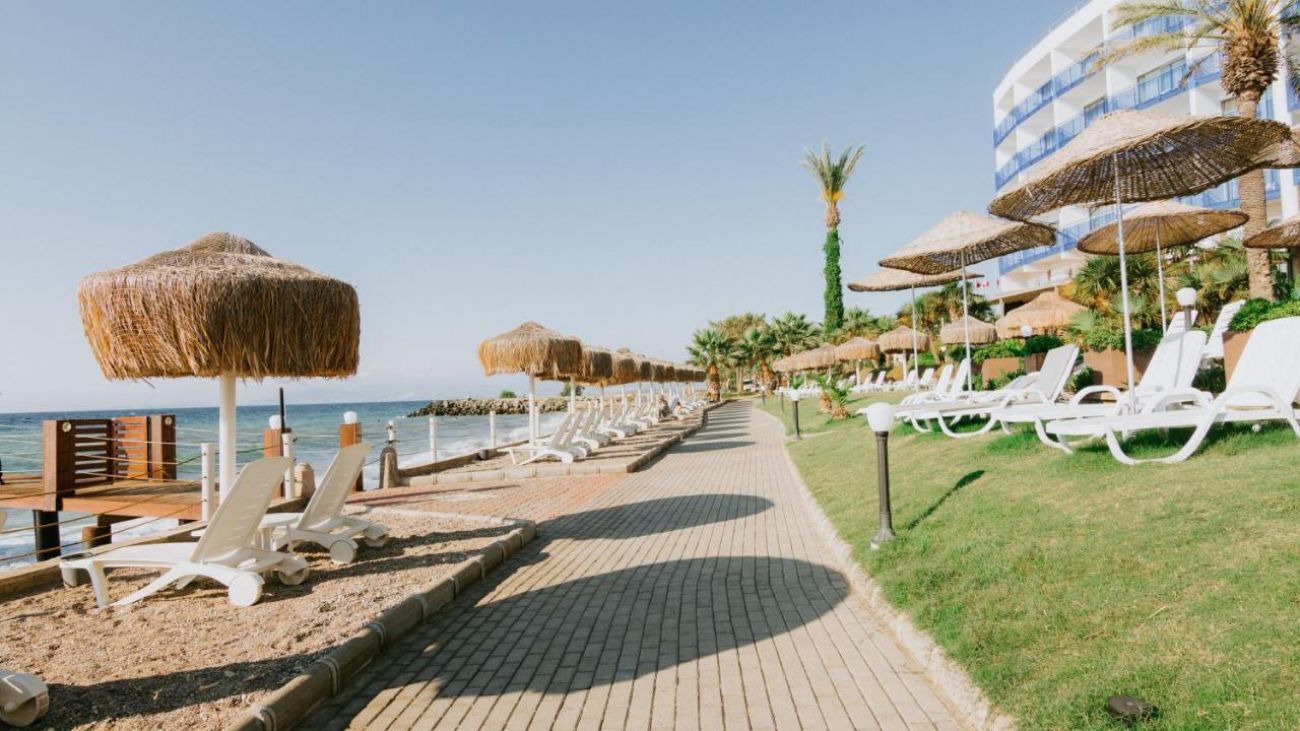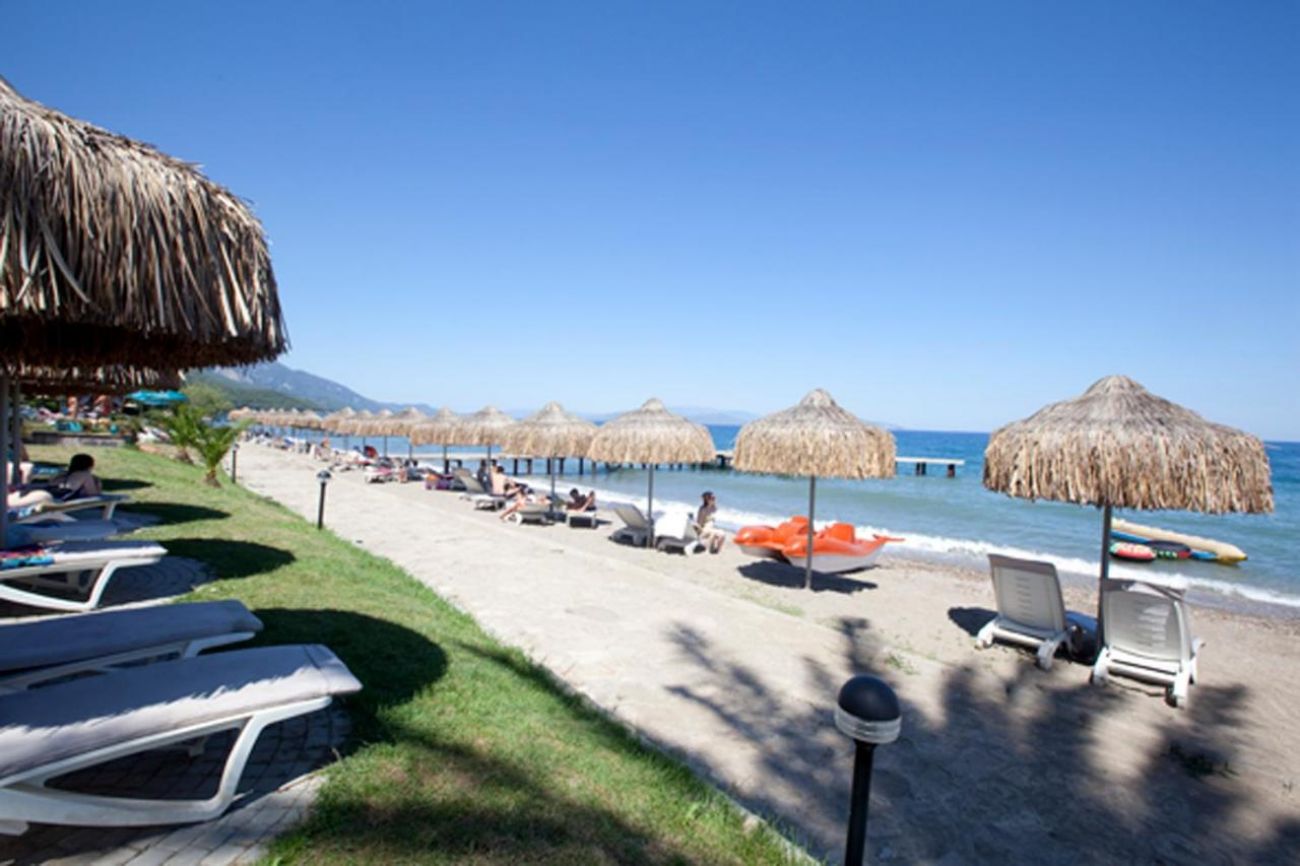 Плаж: собствен, пясъчно-чакълест. Чадъри и шезлонги на басейна и плажа - безплатно.