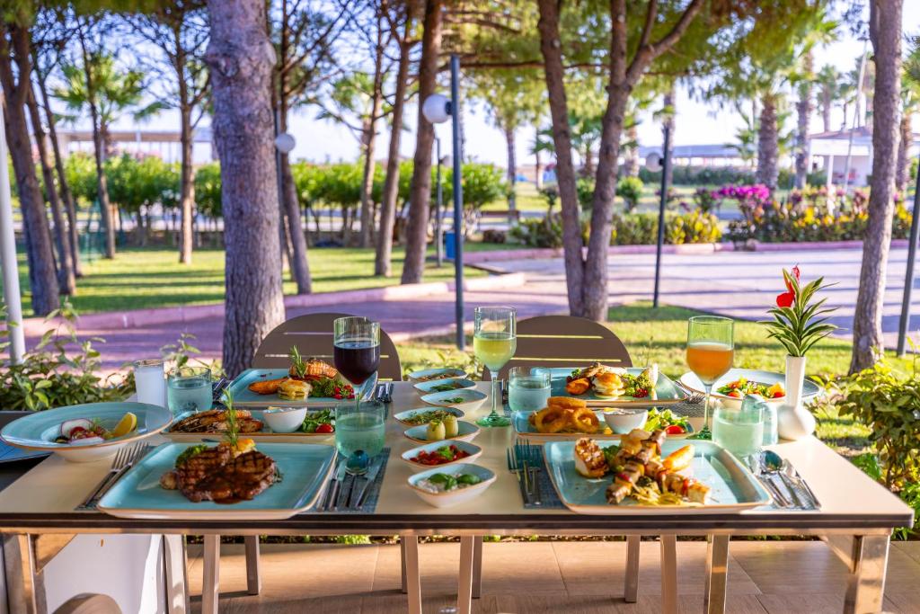 Основен ресторант, 7 а-ла-карт ресторанта (срещу заплащане), бар, 2 открити басейна, аквапарк с 13 водни пързалки, Спа център, сауна, турска баня, масажи, джакузи, безмоторни водни спортове, кану, водни колела. Безплатни услуги: интернет ( в лобито) плажен волейбол, баскетбол, гимнастика, аеробика, тенис на маса, дартс. Платени услуги: билярд, боулинг, видео игри, химическо чистене. За децата: детски басейн, мини клуб, 4 водни пързалки. Плаж: пясъчен, на 450 м. от хотела. Чадъри, шезлонги и плажни кърпи на плажа и при басейна - безплатно.