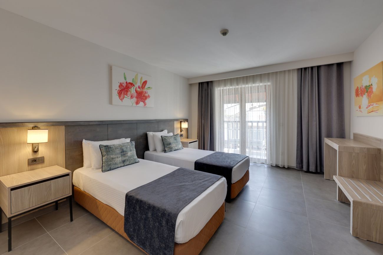Стаи : Promotion room (1 спалня, 1 баня, без тераса - 19 м2), Standard Room Garden View (1 спалня, 1 баня, изглед градина- 19 m²), Sea view room (1 спалня, 1 баня, изглед море - 19 m²), Family garden room (с две отделни спални с врата между тях, 1 двойно и 2 единични легла, изглед суша - 38 m²) Family room sea view (с две отделни спални с врата между тях, 1 двойно и 2 единични легла, изглед море - 38 m²).